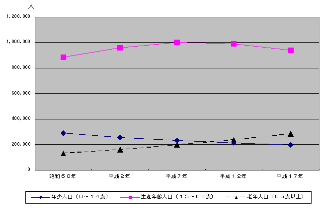 - 人口を年齢別にみると、年少人口(15歳未満人口)は197,136人(県人口の13.9%)、生産年齢人口(15歳以上65歳未満人口)は938,702人(同66.0%)、老年人口(65歳以上人口)は283,528人(同19.9%)となっている。これを平成12年と比べると、年少人口は0.9ポイント低下、生産年齢人口は2.4ポイント低下、老年人口は3.3ポイント上昇している。