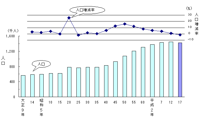 - 人口を男女別にみると、男性が676,375人、女性が744,935人で、女性が68,560人多く、人口性比(女性100人に対する男性の数)は90.8となっており、平成12年に比べ1.1ポイント低下している。