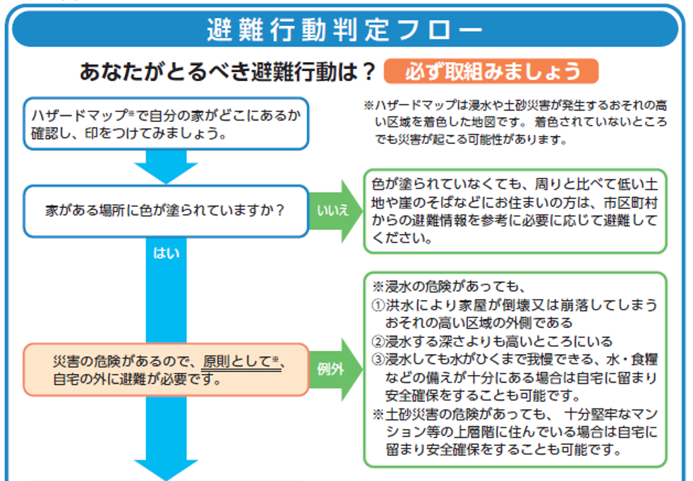 お住まいの市町村のハザードマップと一緒に、下記の「避難行動判定フロー」を確認しましょう。