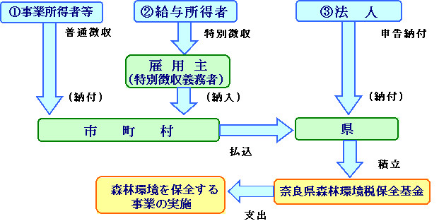 森林は県民全体に対し幅広い公益的機能を果たしていることから、県民全体に幅広く負担していただくという考え方に基づき、既存の税である「県民税均等割」に上乗せする「超過課税」という方法により課税します。
