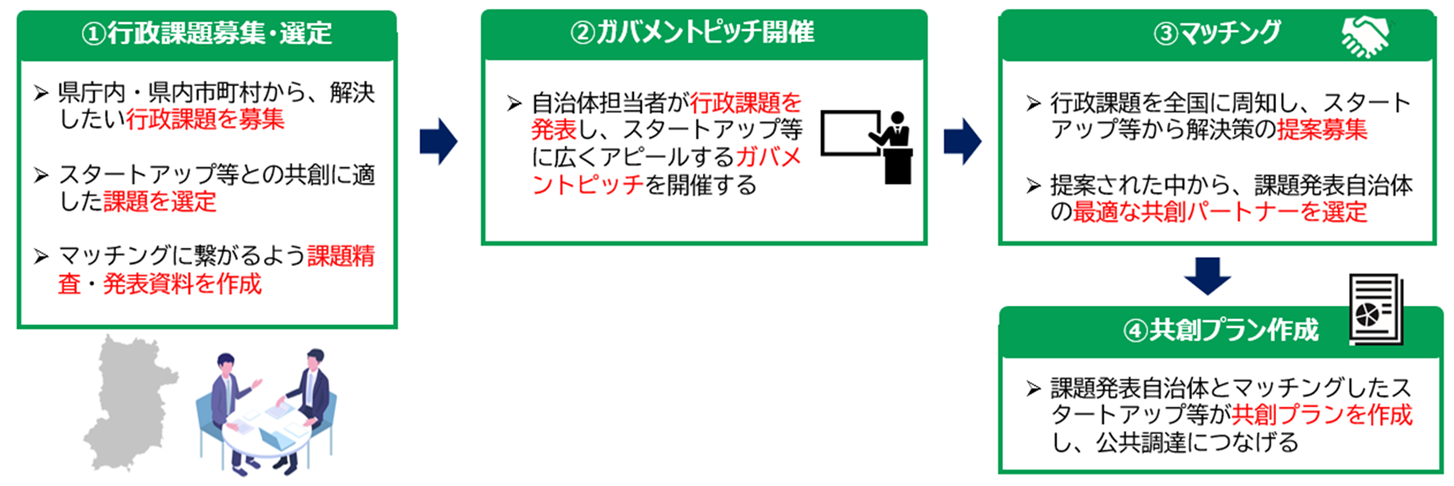 奈良県・県内自治体がオープンイノベーションを活用したスタートアップ等(新しい技術又はサービスを有するスタートアップ、ベンチャー企業又は中小企業)への公共調達促進により、スタートアップ等の提供する新たな製品・サービスを活用した行政課題の解決、ならびにスタートアップ等の市場開拓・需要喚起による県内産業の持続的発展を目指すもの。
