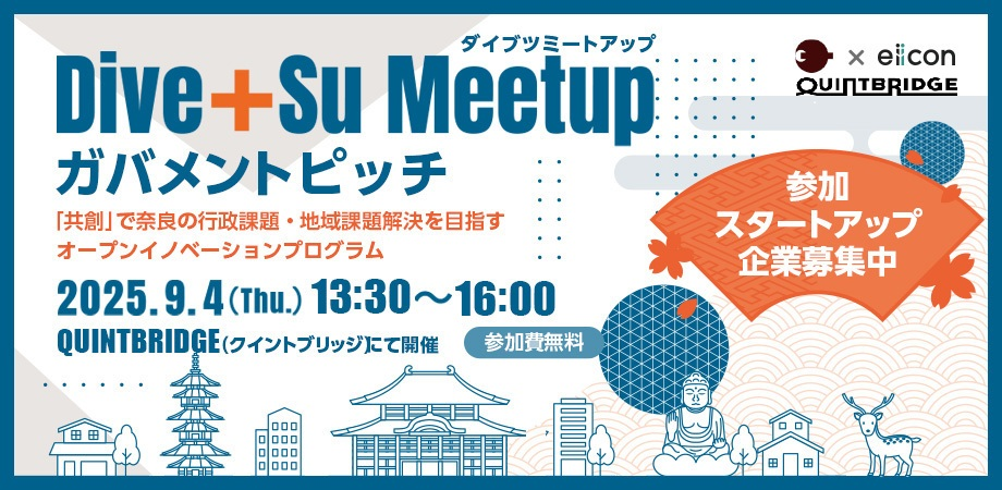 「共創」で奈良の行政課題・地域課題解決を目指すオープンイノベーションプログラム「Dive+Su Meetup」が始動。奈良県および県内市町が解決したい行政課題を発表するガバメントピッチを開催します。