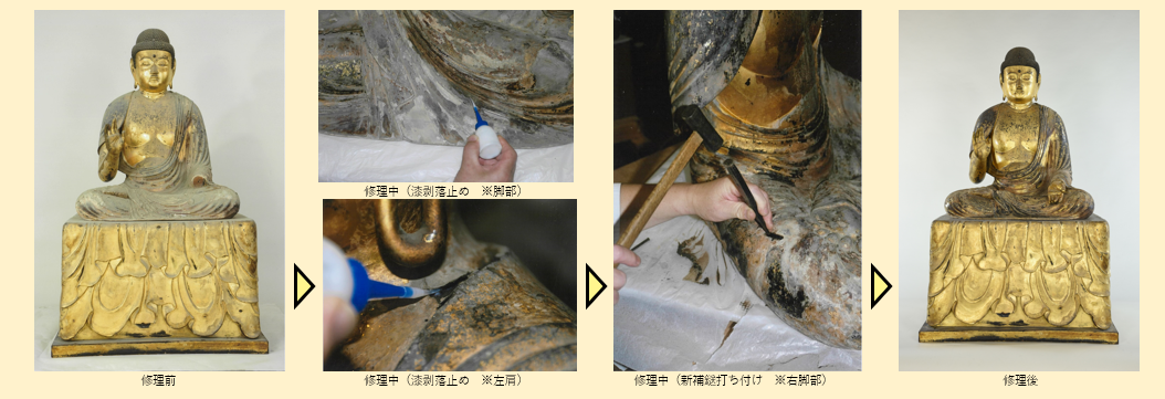 今回の修理では、専門の修理業者が、漆箔を剥がさないように注意しながら、像全体の埃を取り除きました。また、浮き上がった状態になっていた漆箔を固定させる修理を行いました。失われていた左手については、今回新たに製作して、取り付けています。現存する右手と見比べて違和感がないように、大きさや色、形など、細部まで精密に製作しています。