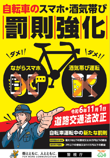 道路交通法の一部改正により令和6年11月1日から自転車の危険な運転に対する罰則が追加されました。