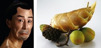 左:生人形『貴族男子像』松本喜三郎、スミソニアン美術館蔵 右:牙彫『松竹梅』安藤緑山、清水三年坂美術館蔵