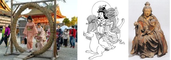 図版左:八坂神社の茅の輪くぐり 中:荼枳尼天像 右:訶梨帝母像(園城寺蔵)