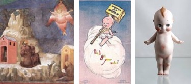 キューピットのもとは、ローマ神話のクピドCupid(ギリシア神話ではamor)で、「情熱的な欲望」。いつも弓矢を持っていて、思い人に求愛の矢を密かに放って恋の取り持ちをします。このキューピットをキャラクター化してキューピーKewpieという愛称を付けたのは、アメリカのイラストレータ Rose Cecil O'Neill。1909年に彼女によって漫画化され、ビスクドールやセルロイド人形として立体化されて、世界的に大ヒット。また婦人参政権のキャラクターアイコンにも使われました。