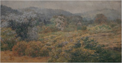 《大邨一水翁真像》(図版1)は、大村による父親の肖像画です。絹地に油絵の具を用いて描かれており、掛け軸に仕立てられた和洋折衷といった趣の作品ですが、ご覧の通り真に迫る見事な写実的描写で、奈良にこんな絵描きがいたのかと以前よりその存在を気にかけていました。しかしほとんど作品が残っておらず、諸先輩が編集した記録集『大和美術史料第1集 孤高の画家 大村長府』(奈良県立美術館 昭和53年)に掲載された数点の図版からその片鱗がうかがわれるのみでした。ところが1年ほど前のこと、同書に掲載された後、長らく所在不明だった代表作《奈良雨中ノ藤図》(図版2)が発見されたとの情報が寄せられました。奈良市郊外の飛火野の風景を捉えた本作は、図版からも伝わってくるほど情感豊かな作品で、かねてから一目実物を見てみたいと思っておりましたので、すぐさま拝見したところ、期待を上回る大村の真価が発揮された名品でした。折しも本年は、大村の没後100年という節目の年にあたり、これは「世に送り出してほしい」という作者からのメッセージに違いないと思いました。ただまったく知られていない無名の画家で、もとより残された作品も少なく、とても個展を開催できる状況ではなかったため、どのように紹介したら良いだろうかと考えあぐねていました。そして大村という画家は洋画家でありながら、とても奈良の絵描きらしい一面を持っているため、奈良の絵師の中で位置づければ、大村の特長とともに、奈良の絵画の特質もご紹介できるのではないだろうかと考え、このような企画に至ったという次第です。