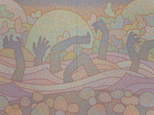 佐竹龍蔵は、2012年に京都造形芸術大学大学院修士課程芸術研究科芸術表現専攻を修了し、現在は奈良県を拠点に活動。日本画材の岩絵具の透明感を生かした独自の点描法で描き、見る距離によって色や形が変化して見える人物画や風景画を描いています。近年は、生まれ育った高知県の四万十川を取材した風景画や、奈良県の吉野川を取材し、妖怪や架空の生き物などのモチーフと組み合わせた作品を制作しています。2021年に奈良に移住し、作家活動の傍ら、美術教師として後進の指導もしています。