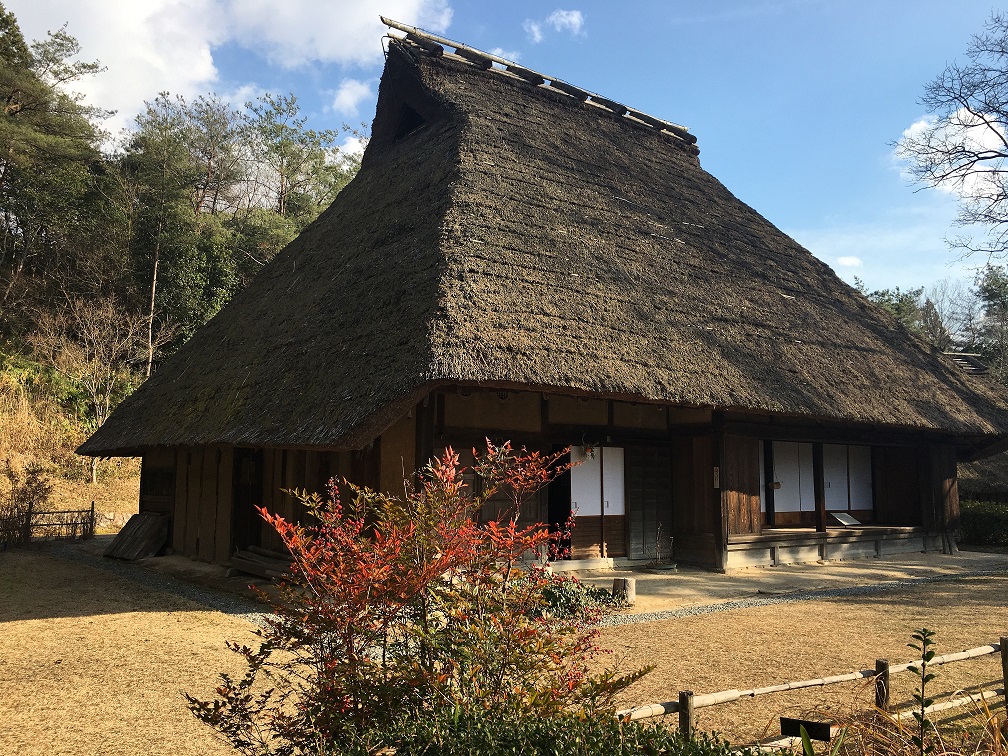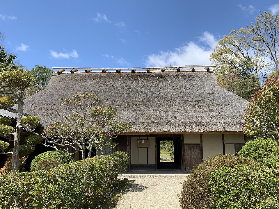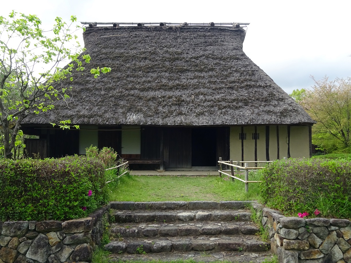 「入母屋造(いりもやづく)り」という形(かたち)の茅葺(かやぶ)き屋根(やね)をした農家(のうか)。