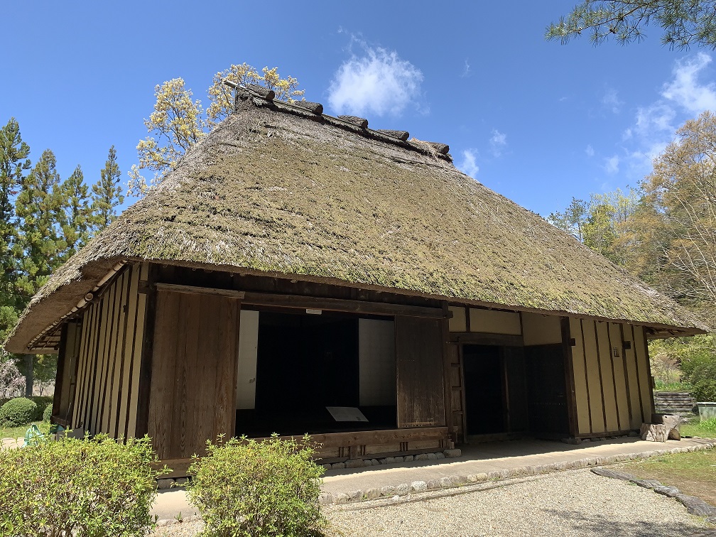 平地(へいち)に比(くら)べて雪(ゆき)が多(おお)い地域(ちいき)の民家(みんか)。大(おお)きな屋根(やね)が特徴(とくちょう)。2階(かい)は絹糸(きぬいと)を作(つく)るためにカイコを育(そだ)てるのにも使用(しよう)。かまどの周(まわ)りには流(なが)しや唐(から)臼(うす)、戸棚(とだな)があります。かまどの上(うえ)には煙(けむり)を利用(りよう)して魚(さかな)などを燻製(くんせい)にする時(とき)に使(つか)う「ベンケイ」(吉野(よしの)地方(ちほう)では「ホデ」など)と呼(よ)ばれるワラづとが吊(つる)されています。