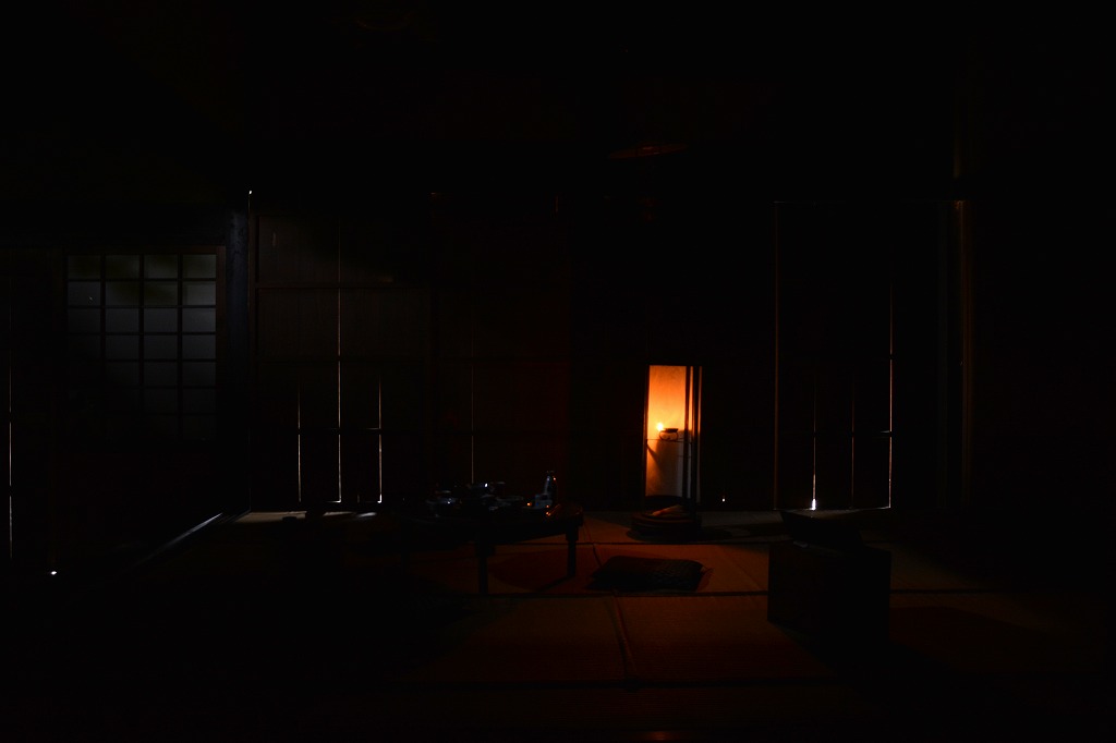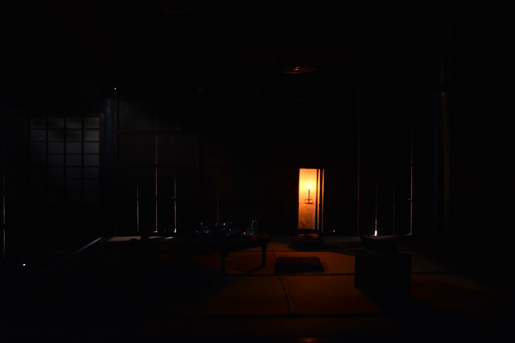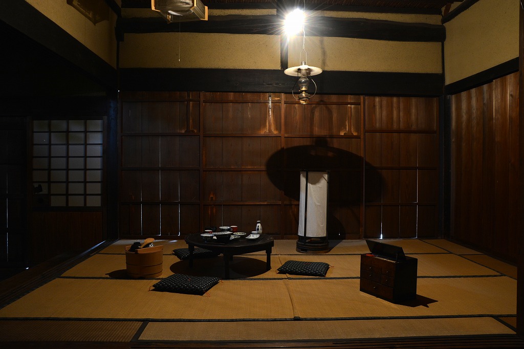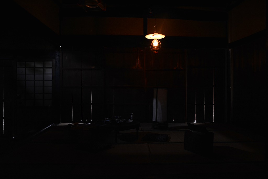 日本でろうそくが作られ始めたのは今からおよそ600年前の室町時代といわれています。ろうそくは高価で貴重だったため、使う場面は限られました。普段の生活には灯明が使われました。灯明は油を燃やしてあかりにするもので、鯨の脂や魚の脂、植物の種から絞った油が使われます。明治時代になると石油ランプが輸入され、灯油を用いた照明が一般的になります。ガス灯は街灯などで活躍しますが、ガス管を配管しないとならないので家庭では普及しませんでした。大正時代になって電球が普及し始め、電気の時代が到来します。ここでは、古民家でそれぞれのあかりを撮影した写真を紹介します。同じ室内で照明によってどのくらい明るさが違うかみてみましょう。