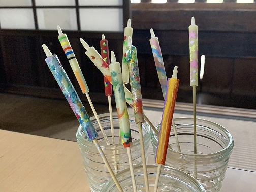 ろうそく、アクリル絵の具、筆、竹串