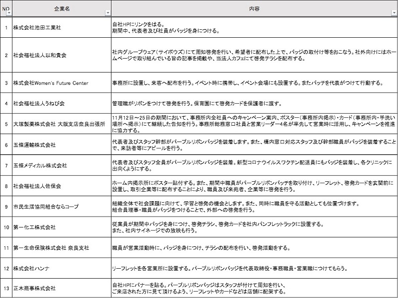 なら女性活躍推進倶楽部会員企業13企業がパープルリボンキャンペーンの啓発取組を実施します。