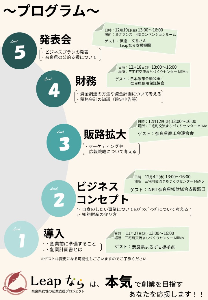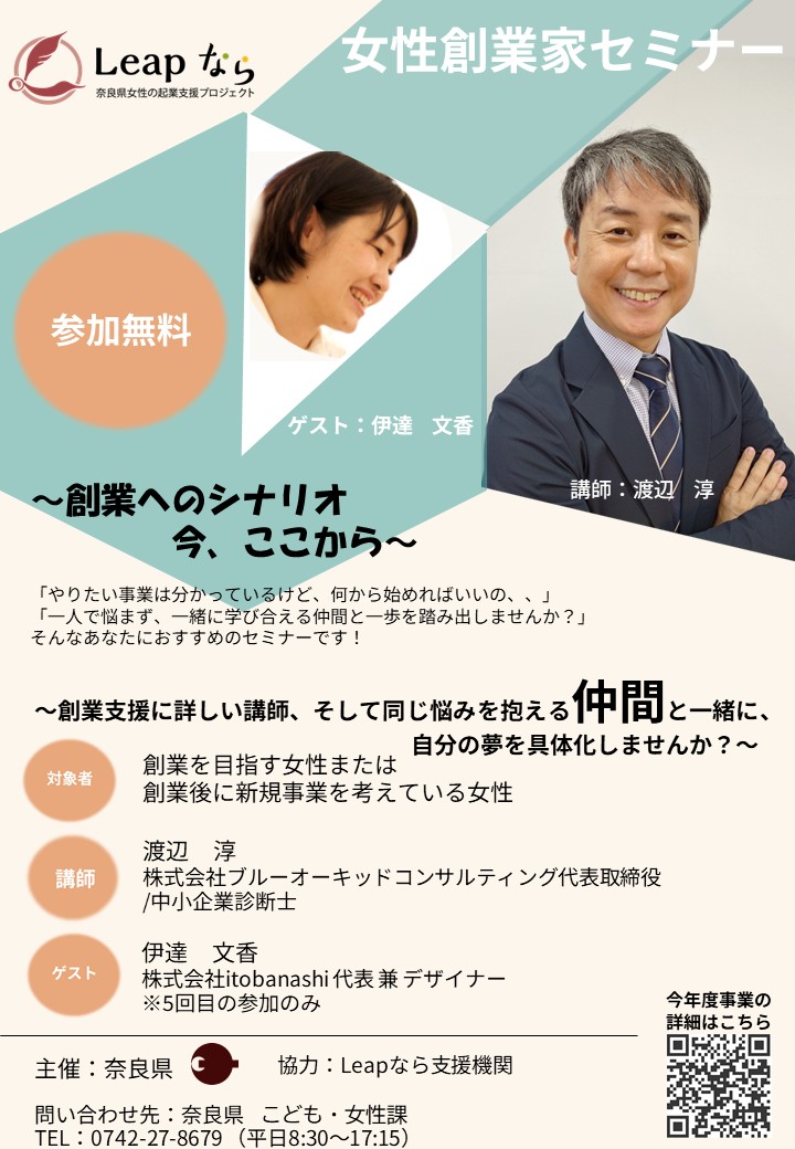 トップページ > くらし・環境 > 人権・平和 > 男女共同参画 > 女性の就労・地域活動の支援 > Leapなら(奈良県女性の起業支援プロジェクト) > セミナー・相談会情報 > 令和7年度女性創業家セミナー