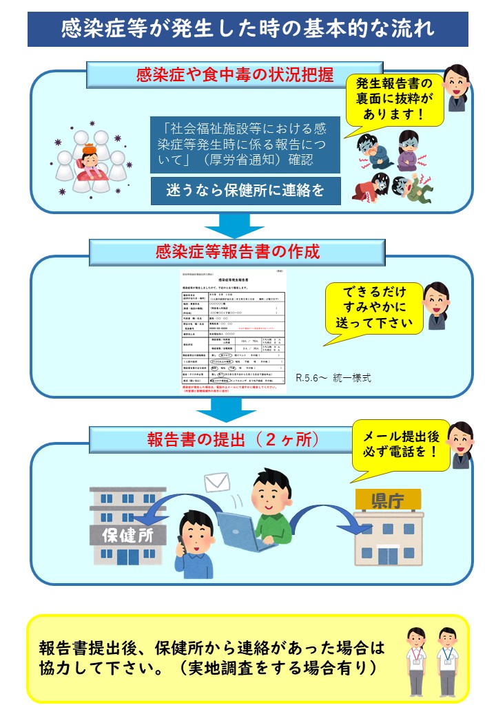 障害福祉サービス事業所・施設等において、利用(入所)者や職員に、感染症や食中毒等が集団発生した場合は、下記様式により障害福祉課及び保健所に報告してください。