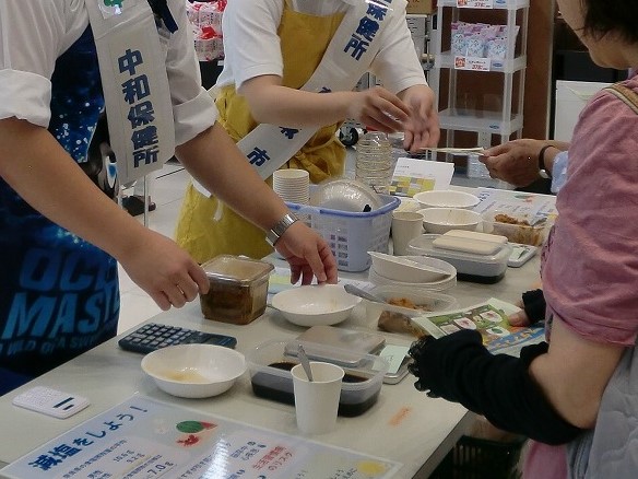 おいしく食塩を控え、野菜たっぷりのお惣菜のご紹介(韓国風海苔!チョレギサラダ、ハムとポテトのミックスサラダ)、野菜たっぷりレシピの配布や、野菜摂取の目標量である350gを学べるクイズ、調味料に含まれる食塩量に関する体験コーナーや、食塩摂取量を再確認できるチェックシートなど、楽しみながら減塩や野菜摂取について学べるイベントを実施し、たくさんの方にご参加いただきました!
