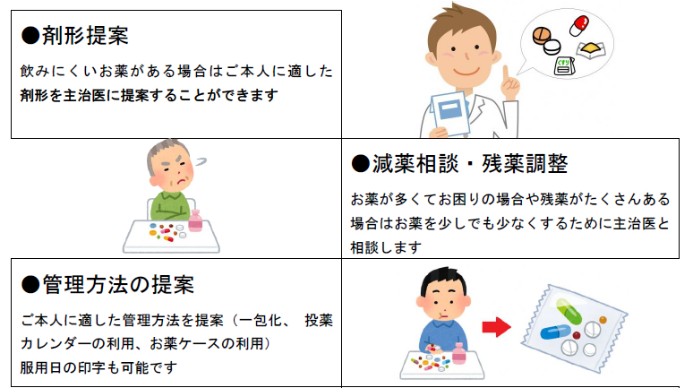 自宅での療養される患者様に対し、処方されている薬剤について正しい服薬法、管理方法などについて、助言することが在宅医療における薬剤師の役割のひとつです。