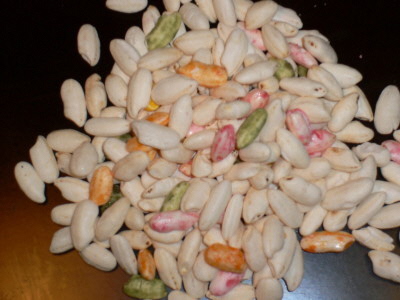 関西風は、いろんな色のあられ、関東風はいろんな色のハデポン(ポン菓子)になっています。