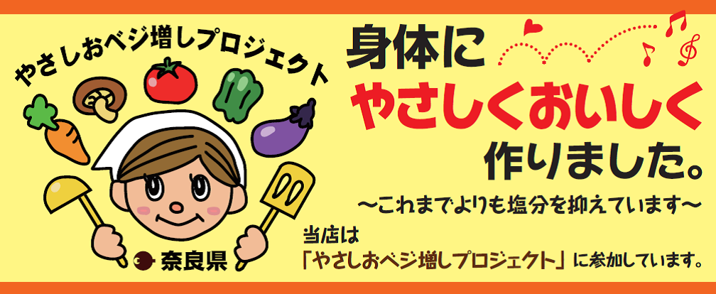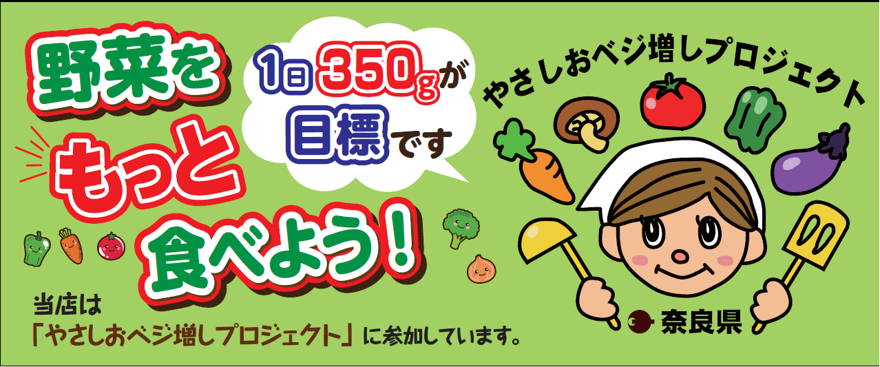 奈良県では健康寿命日本一をめざし、スーパーマーケット等との連携協働により、中食(そう菜や弁当等)の減塩および野菜増量の取り組みを行い、健康な食事が入手できる食環境を作っています。この取り組みを「やさしおベジ増しプロジェクト」と名付け、県内全域への普及を図っています。