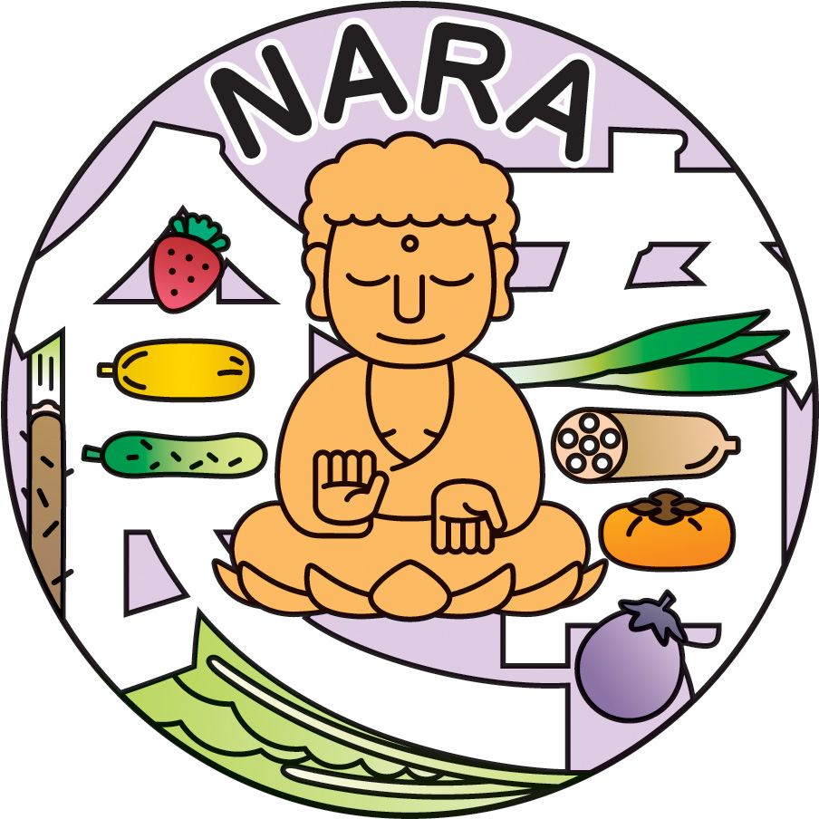中心に奈良のシンボルである盧舎那大仏像を、また、周囲に大和野菜および奈良の特産品9品を配することにより、奈良県産食材の活用や奈良の食文化・歴史への理解を深めながら、奈良県の食育を進めることを表現しています。