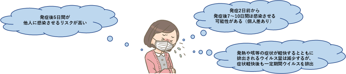 また発症後10日間が経過するまでは、他者に感染させるリスクがあることから、不織布マスクの着用やハイリスク⁽*⁾者との接触は控えることが推奨されています。