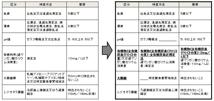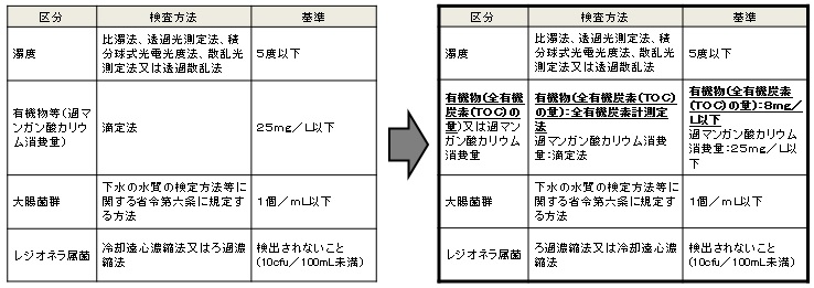改正により、旅館業法許可施設及び公衆浴場許可施設において遵守すべき水質等の基準が変わりましたので、下記についてご確認のうえ、適切な管理をお願いします。