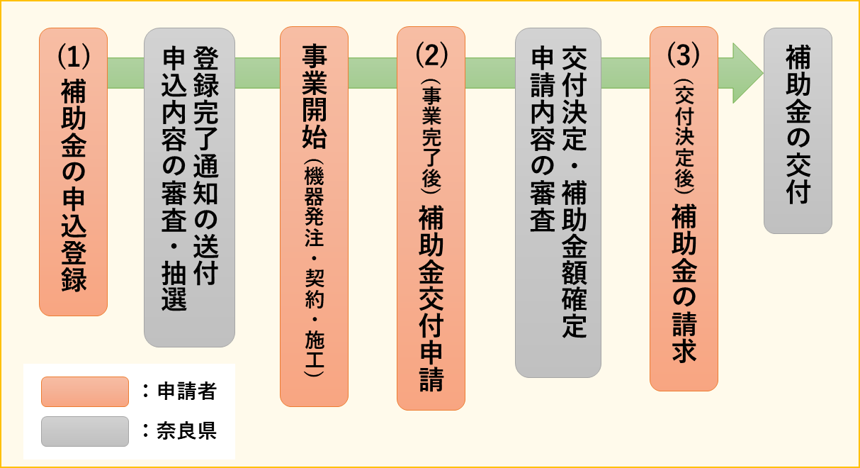 申込完了後、奈良県より登録完了通知を発出しますので、必ずその通知日以降より事業(機器発注・契約・施工)を開始してください。