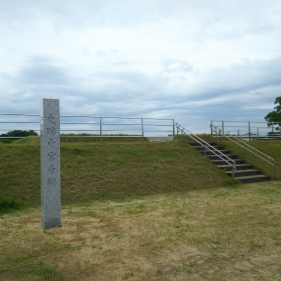 中宮寺跡史跡公園には、1箇所から法隆寺の五重塔・法輪寺の三重塔・法起寺の三重塔の、「斑鳩三塔」が全て見える、貴重な場所があります。また、中宮寺の塔と金堂のあった基壇が復元されていて、秋には一面に広がるコスモスを上から見渡すことが出来ます。