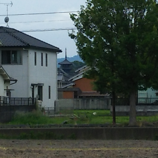 この場所から移動せずに、法隆寺・法起寺・法輪寺の3塔が全て見えます。上の写真を参考に、ストリートビューで探してみましょう。