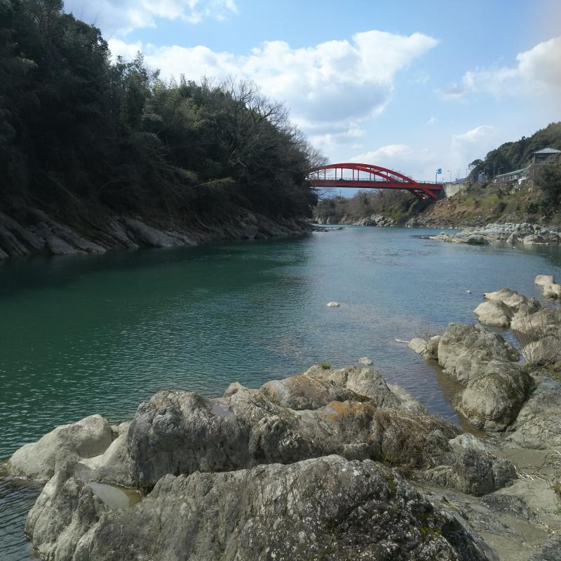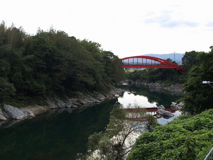 周辺の道路から眺める赤色の栄山寺橋は、青色の川の流れや白色の川辺の岩とのコントラストが美しいです。深い谷すじを流れてきた吉野川は、栄山寺橋の先からは五條の盆地に流れ込み、広い河川敷を伴うようになります。