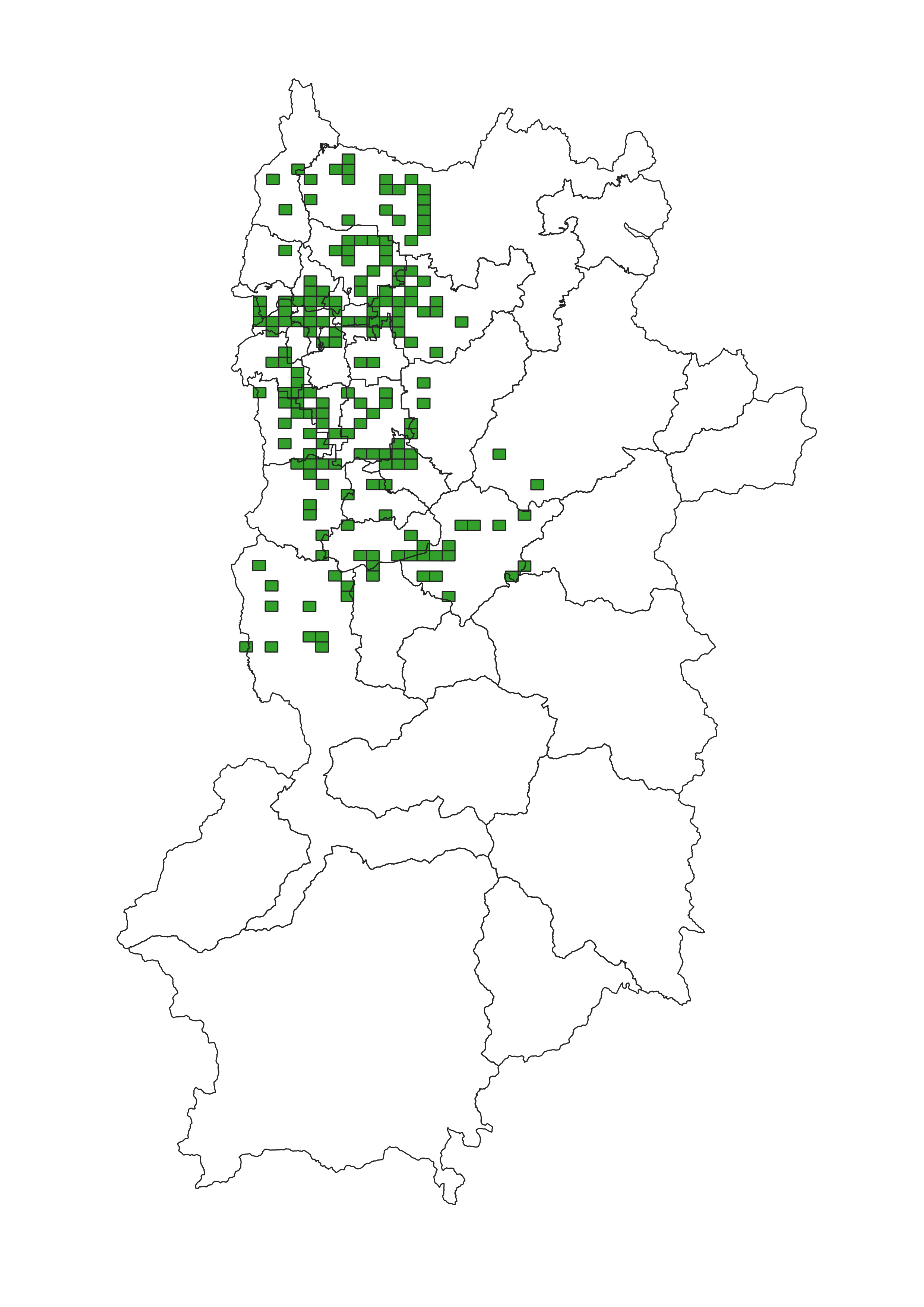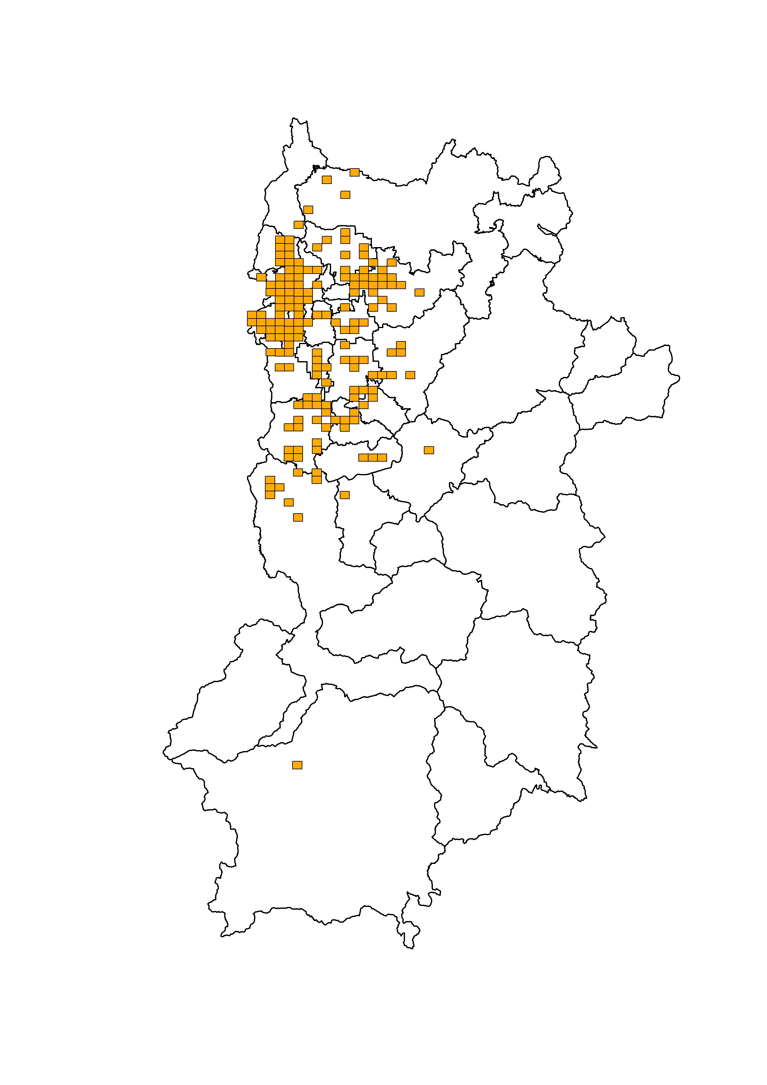県内を1km×1kmのマス目に分割し、被害木及び成虫が確認された地域のマスに色を付けて表示しています。
