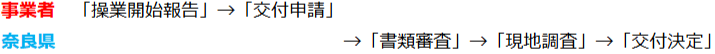 操業開始後、補助対象額をご申請下さい(交付申請)。交付申請後、奈良県で書類審査、および現地調査を行った後、交付決定いたします。