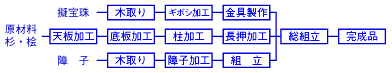 乾燥させた吉野杉を使用します。数種類の部材を加工し、ホゾ穴を開け、底板を基礎にして組み込んで作られています。現在、床の間、玄関の置物などに使われています。