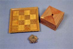 釘を使わず、木(神代杉、春日杉、吉野杉等)の接合に伝統的な組み手技法(木口組み、菱組み、亀甲組み等)を用いて、盆、卓、茶道具などが作られています。