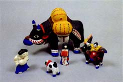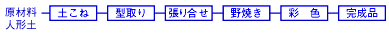 1週間程、陰干し乾燥し、もみ殻で焼き上げ、胡粉に膠を混ぜて下塗りする。乾燥後、泥絵具で彩色して作られています。