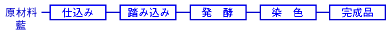 土間に作られた藍ガメに藍玉、木炭、石灰、小麦粉、水などを混合し、自然発酵させ、可染用糸あるいは布を何度も浸け、最後に天日乾燥させ、仕上げています。