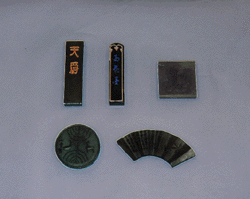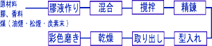 膠(にかわ)と煤を混合させ、練り、型入れ、成型、乾燥、磨き、彩色の工程を経て作られます。
