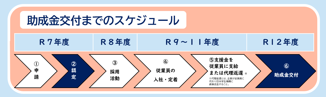 - 奨学金返還支援金を支給した助成対象候補者からの申請に基づき、令和12年度に助成対象者として認定します。