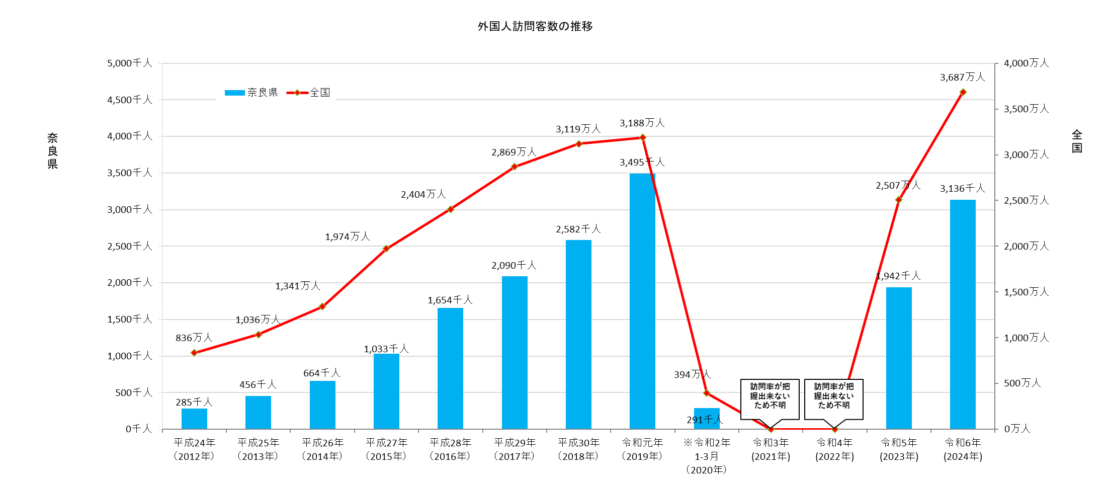(※令和2年4月~令和4年12月までの奈良県外国人訪問客数は、観光庁「訪日外国人消費動向調査」による奈良県訪問率が把握出来ないため不明となっています。)