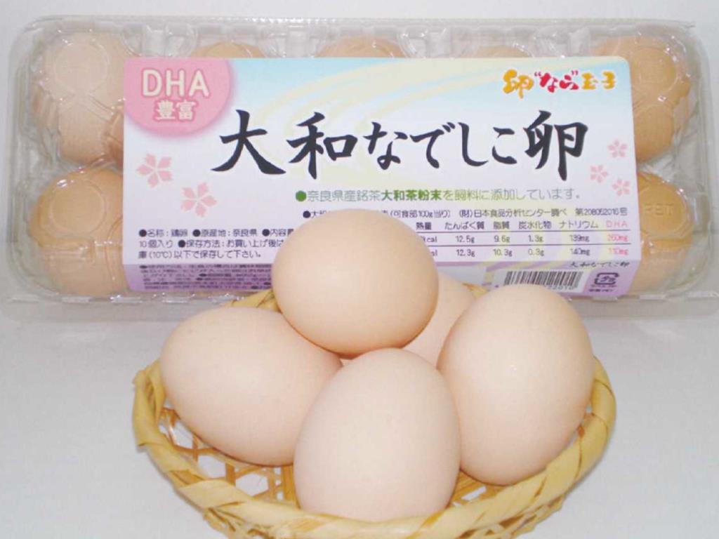 「大和なでしこ卵」は奈良県ブランド卵で、親鶏に大和茶の粉末や魚油を配合した良質な飼料を与えるのが特徴です。魚油由来のDHAをはじめとした栄養分が豊富に含まれるほか、大和茶由来のカテキンにより卵特有の生臭さが軽減されています。