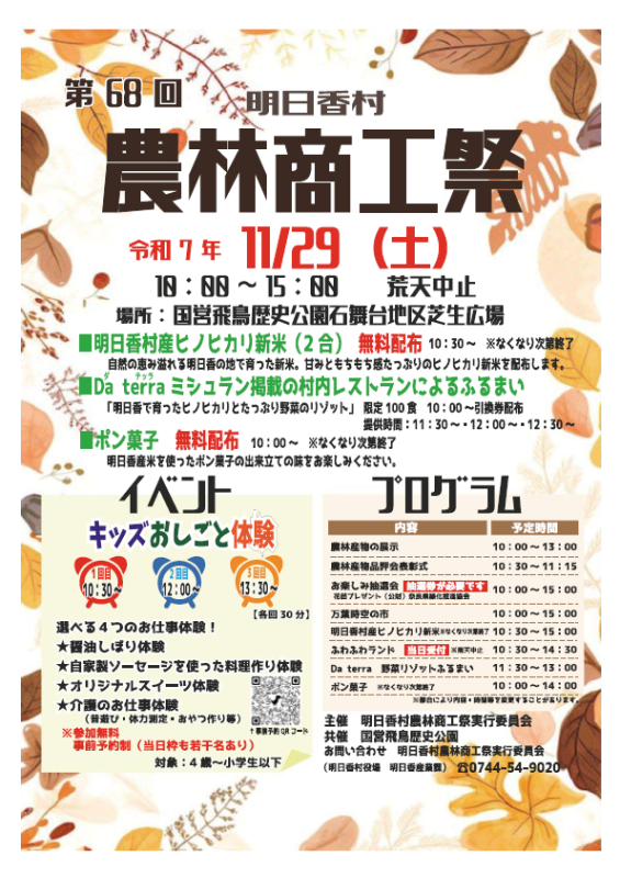 トップページ > しごと・産業 > 農林水産業 > 農林水産物ブランド化 > 食と農のイベント情報 > 令和7年度食と農のイベント情報 > 第68回明日香村農林商工祭