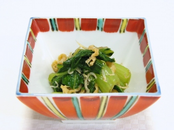 - 3 フライパンにサラダ油を入れて加熱し、ちりめんじゃこと大和まなの軸を炒める。全体に油がなじめば、葉の部分と合わせ調味料を加え、水分を飛ばすように炒める。仕上がる直前に、油揚げを加えて炒める。
