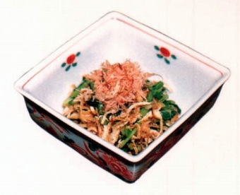- 3 (1,2を合わせて醤油をふりかけて軽く合わせまぜ、けすりかつおをふり入れて、よくませ合わせて盛り入れる。