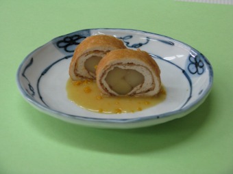 - 5 冷ました薄揚げ3辺の端を切り、破れないように広げ、揚げの長さに切ったずいきを上にのせて手前から巻き、終わりにかたくり粉を均等にふり、巻き上げる。