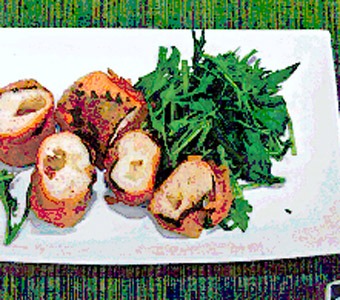 - 4 3の上に青ジソ2枚を横に並べ、その上に2のチーズを横に並べる。