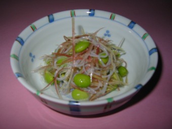 - 3 みょうが、枝豆、春雨を混ぜて器に盛り、からしじょうゆを添える。