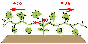 本枝は本葉5~6枚で止め、大きな子づる3本を伸ばします。