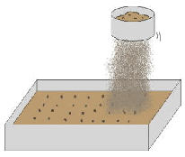 トロ箱などに、均一にばらまきします。発芽には光が必要なので、覆土は薄くか、しなくても良く、発芽が揃うまで乾かないように寒冷しゃで覆い、涼しい場所に置きます。