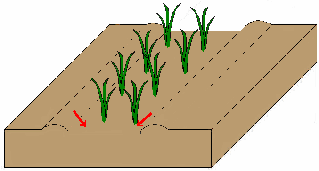 ネギの種子は寿命が短い(約1年)ので、古い種子を使わないことが肝心です。条間25cmで条まきとします。薄く土をかけ、さらにもみ殻を薄く振りかけ、くわで軽く押しつけた後、十分灌水します。